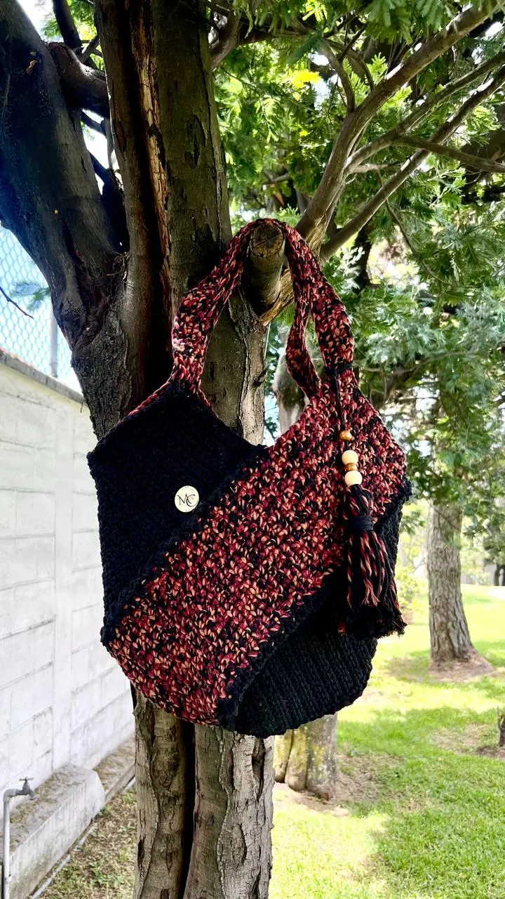 Hermosa cartera tejida a crochet en tono negro con una combinacion de colores cafe, habano y vino, es un bolso muy amplio con detalles elgantes, tejida con hilo macrame  peinable.